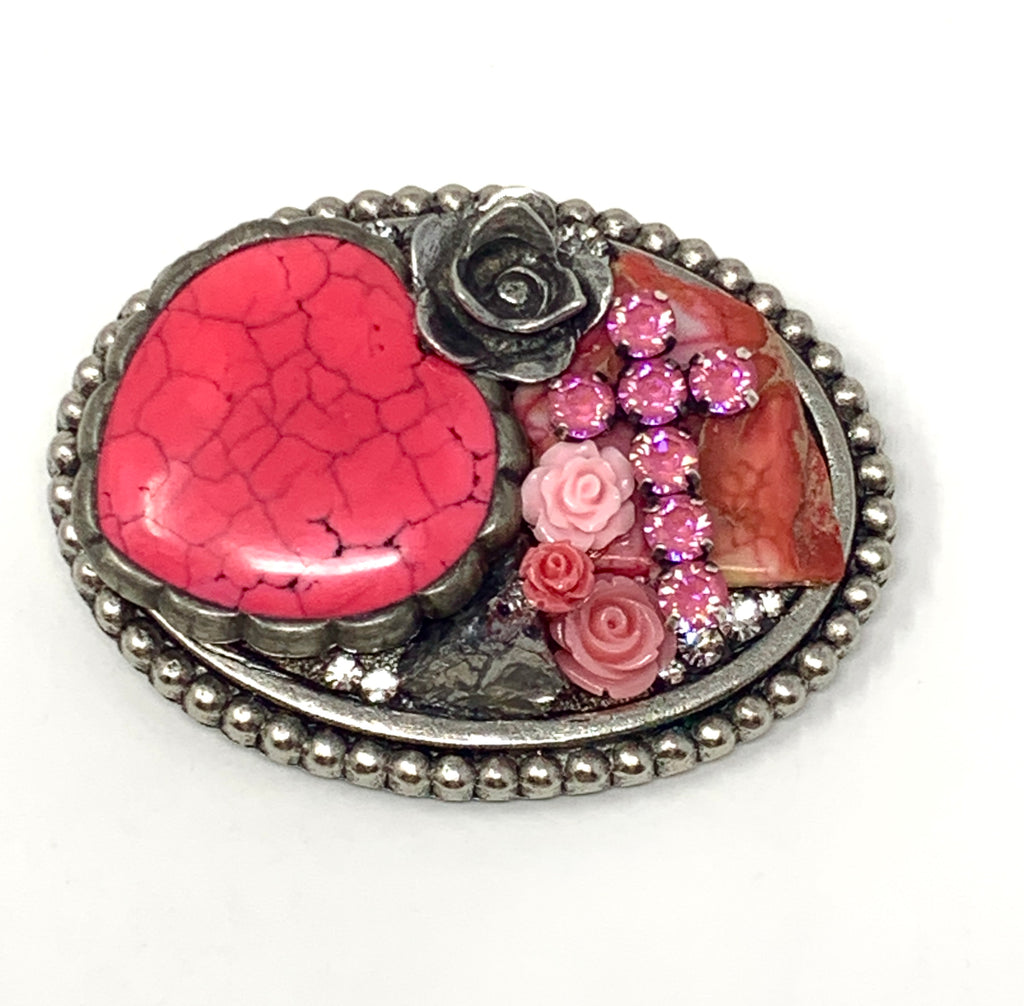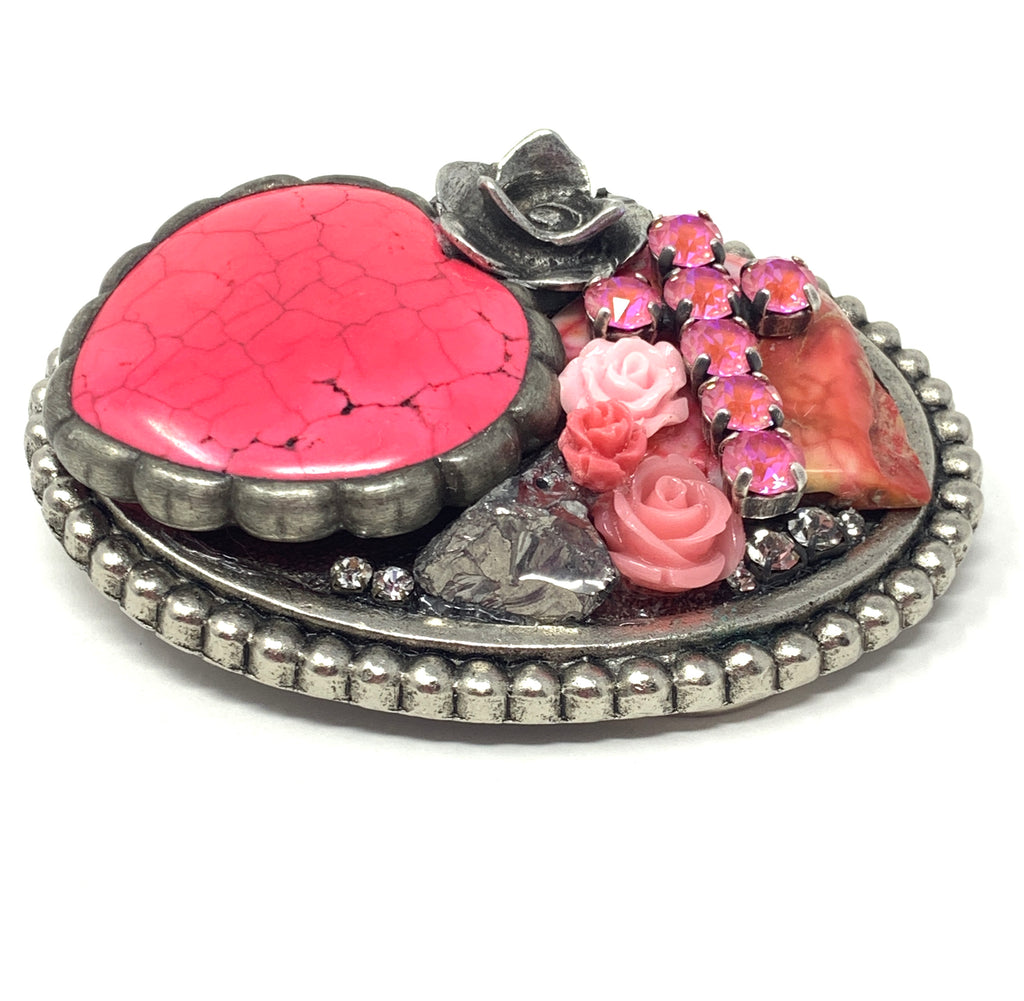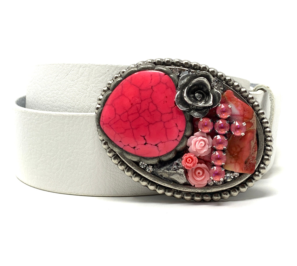 This beautiful buckle features a large coral coloured Howlite heart, Jasper, Quartz, a stunning crystal cross and a lovely garden of flowers. A gorgeous accent to any outfit!