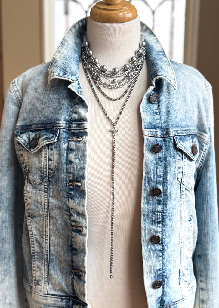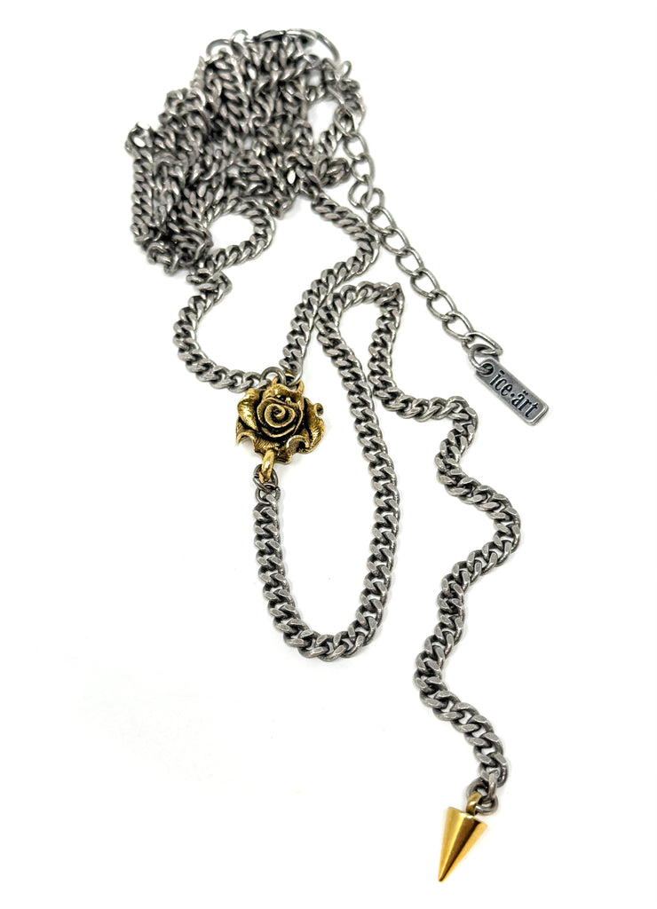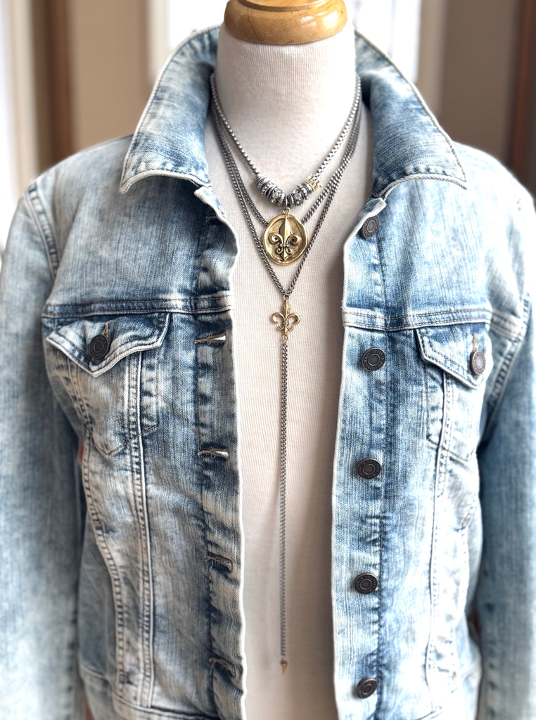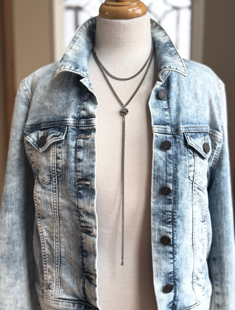 This double chain necklace adds a splash of easy style to any outing, night or day. Beautiful and simple on its own, as well as the quintessential layering piece. The long chain dangle is absolutely perfect peeking out from underneath any loose layer.