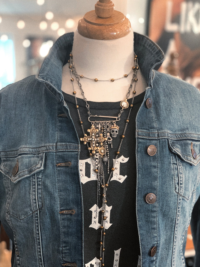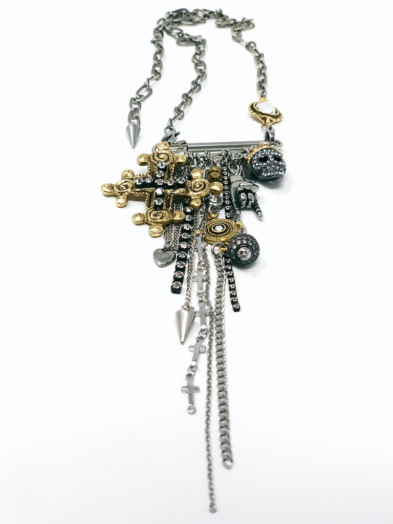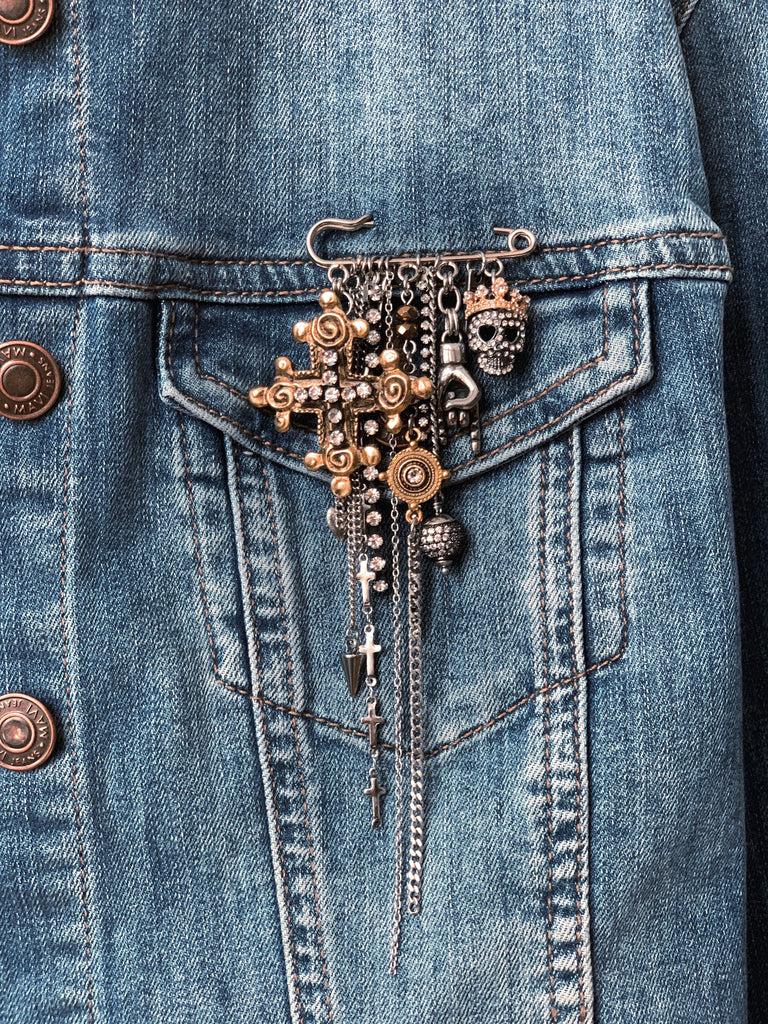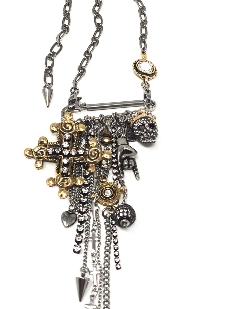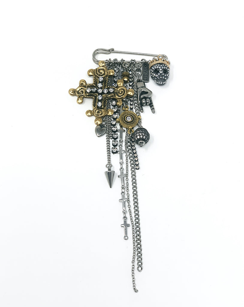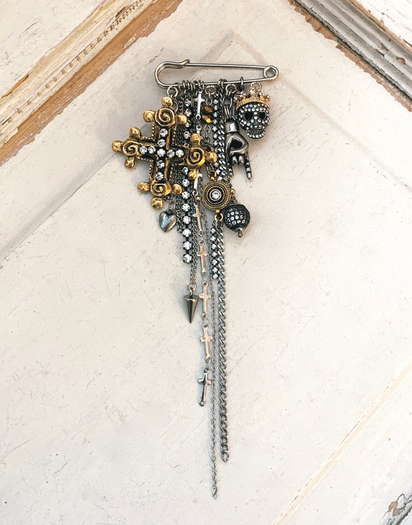 This stunning pin features an old world style Cross, Crown Skull, the "warding off evil" (or lucky) hand, and many other unique crystals, beads and charms. Fabulous and fashionable on any jacket and with the help of the Ice Art Pin Switch you can transform it into a gorgeous necklace!
