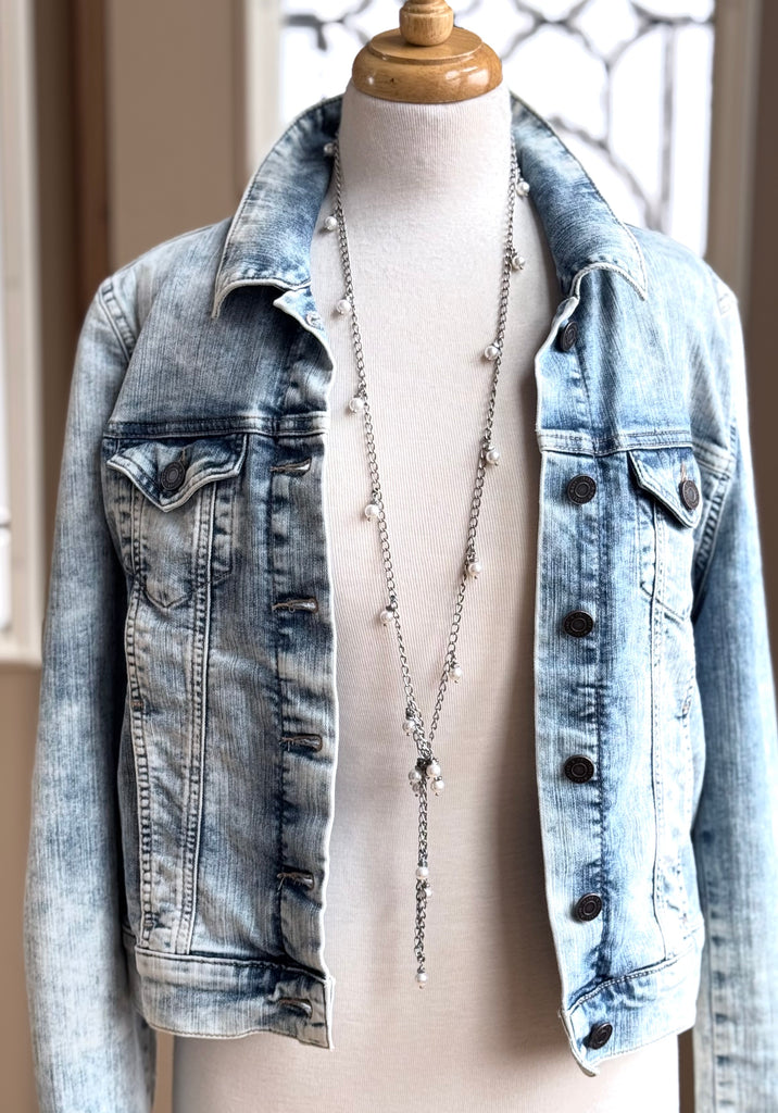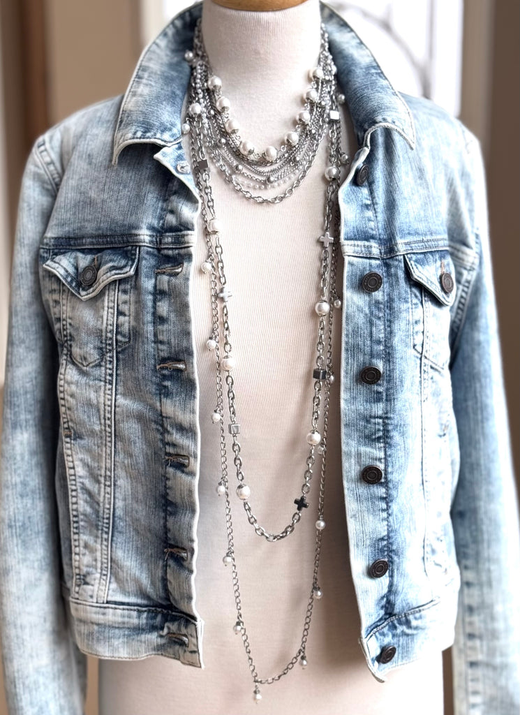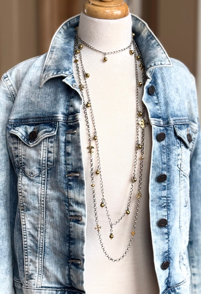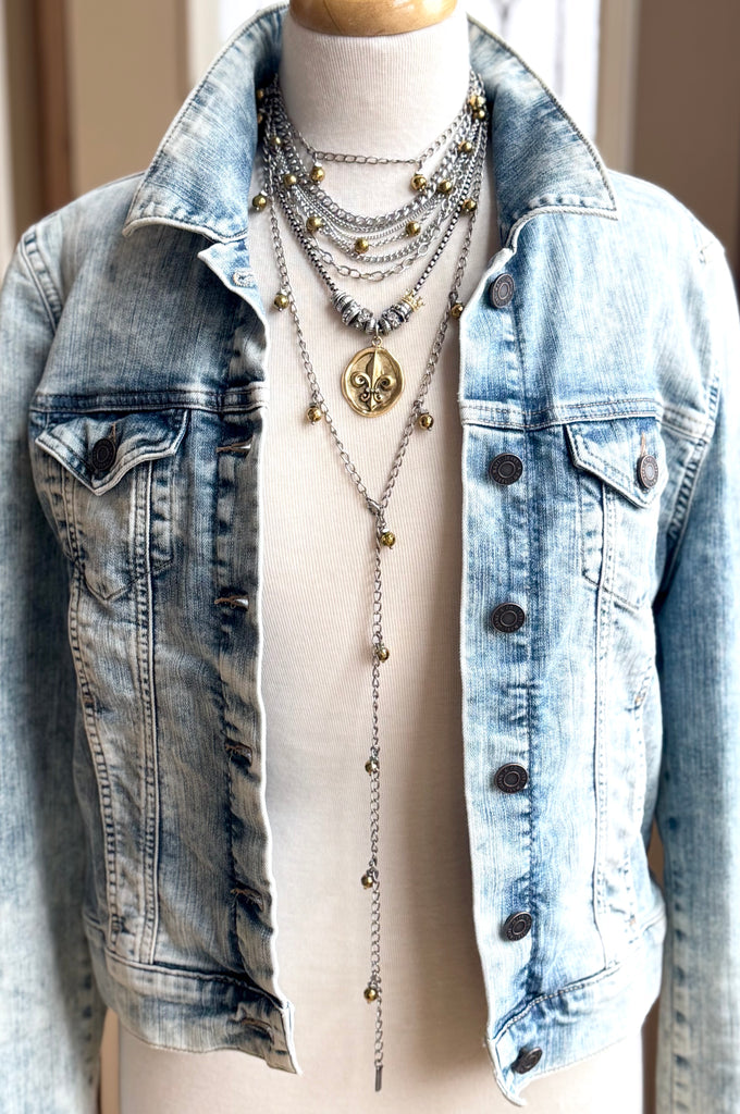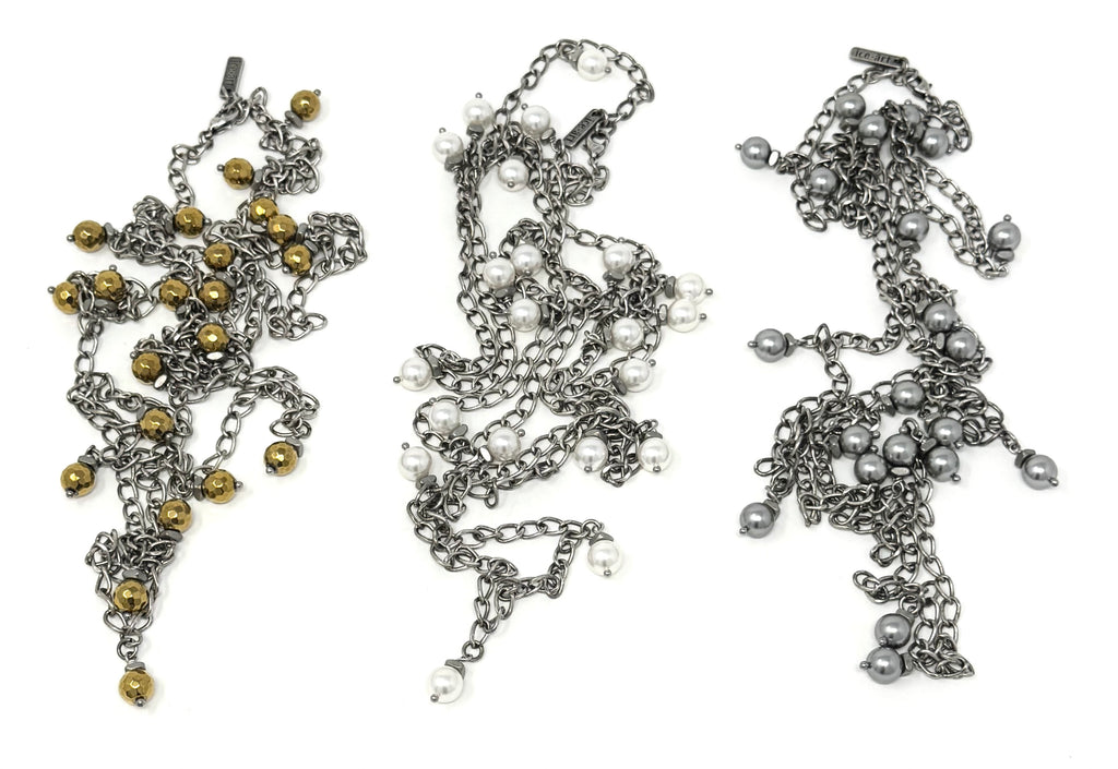 At 53" in length this is one diverse piece! The necklace of many styles! There are at least SIX ways (that we know of) to wear this aptly named Chameleon Chain. Choose from gold, white and grey.....each one adding a splash of style to your day (or night!).